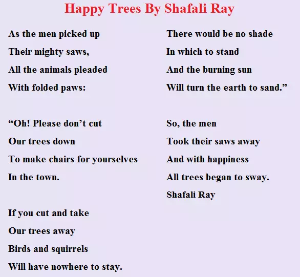 कविता “हैप्पी ट्रीज़” में कवि जंगली जानवरों और हमारी पृथ्वी पर वनों की कटाई के प्रभाव का वर्णन करता है। हम मनुष्य इसके परिणामों की परवाह किए बिना अपने उपयोग के लिए अंधाधुंध जंगलों को काट रहे हैं। कविता में पाँच छंद हैं। जब जानवरों ने मनुष्यों के हाथों में शक्तिशाली आरी देखी, तो वे डर गए, क्योंकि ये लोग पेड़ों को काटने जा रहे थे। जानवरों ने अपने पंजे मोड़कर पुरुषों के सामने मिन्नतें कीं।